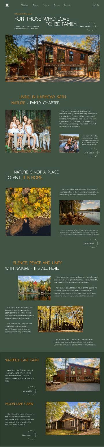 Разработать многостраничный сайт в современном дизайне. Сделать упор на семейные ценности, передать через дизайн атмосферу семейного отдыха, арендуя коттедж у озера и леса. Дать возможность пользователям ознакомиться с информацией и забронировать коттедж, а также связаться с Ниной для уточнения информации.
